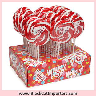 Display box contains 24 wrapped Red & White Swirl Whirly Pops, each with a net weight of 1.5 ounces.