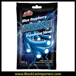 Livewires Blue Raspberry is delivered in a peg bag. Each piece is filled with sweet cream and wrapped with a blue raspberry licorice shell.